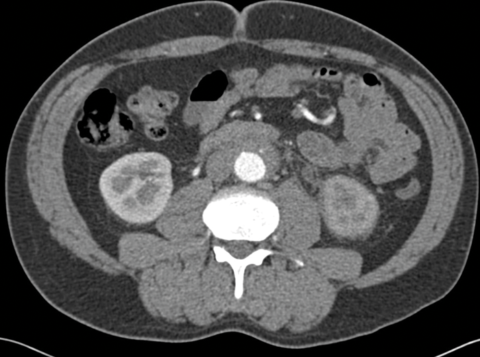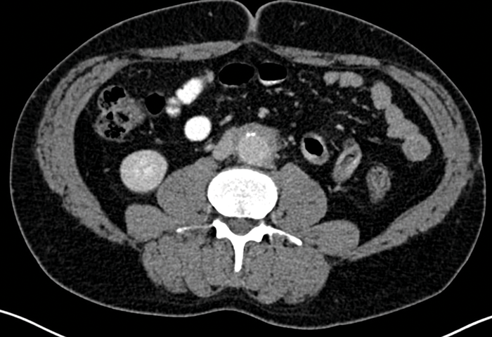 CT is the primary imaging modality used in patients with RPF. It allows evaluation of the location and extent of the fibrosis, as well as assessment for complications including ureteric obstruction or invasion into other vascular structures. CT usually shows an irregular soft tissue mass surrounding the aorta and enveloping the ureters and IVC (Figure 2). The soft tissue has similar Hounsfield units to muscle and the fat plane between the tissue and the psoas may be obliterated.