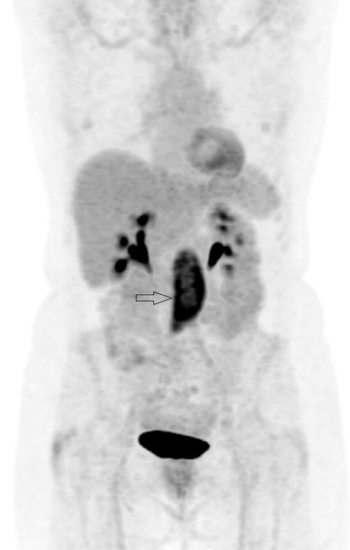 Figure 6: Coronal PET-CT image shows intense uptake
