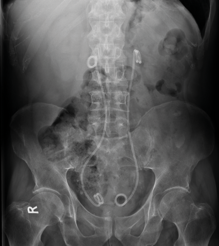 Before treatment commences, if there is ureteric obstruction, ureteric stenting is often required. The medial deviation of the ureters can be seen on abdominal X-Ray if stents are in place, as the stent can be visualised in the lines of the ureters (Figure 1).