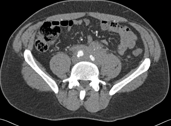 The ureters may be medially deviated due to the fibrotic tissue, rather than laterally deviated as is seen in cases of lymphoma or extensive retroperitoneal lymphadenopathy from other causes. The fibrotic tissue may be seen to extend to encase the common iliac arteries as well as the aorta, depending on the extent of the disease (Figure 3).