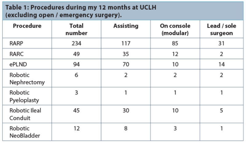 When I arrived I was taken to the Chitra Sethi Centre for Robotics (http://uchmas.org/chitra-sethia-centre-for-robotics), which is the first and only robotic training centre in the UK. The unit has a Mimic dV-Trainer®, a RoSS™ Robotic Simulator and two da Vinci® Robots for dry and wet lab training. It was here that I spent an intensive two weeks on dry and wet lab (including urethro-vesical and ileo-urethal anastomoses and formation of neo-bladders). After passing all the preset competencies in the lab, I progressed to the operating theatre. Here I was given a named mentor with whom I formed a learning agreement, outlining my predicted operative progress over the next 12 months. My initial role was to position the patient, insert the ports and dock the robot. Once competent at this, and after watching 10 procedures, I began to participate as first assistant by the bedside. Once comfortable with this I was promoted to console surgeon, carrying out a rigorous modular programme under close supervision of the mentoring consultants (Table 1). I’m pleased to say that I progressed well in this fertile high-volume environment, and within 20 weeks of starting at UCLH I performed my first solo case.