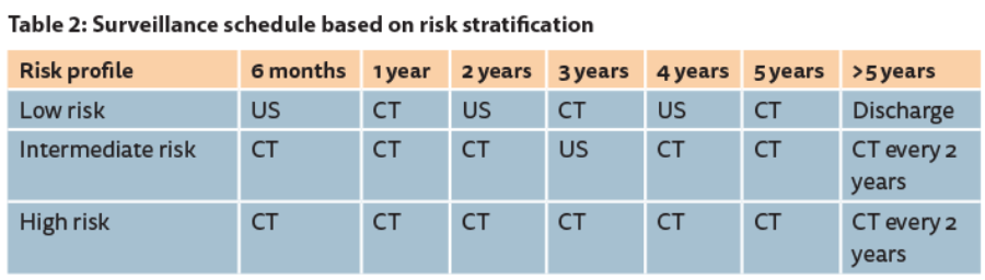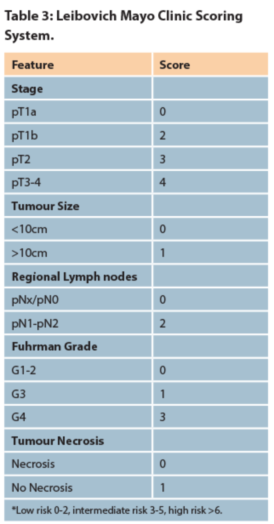 There is no agreed consensus as to which protocol should be followed or the length of duration of follow-up however, many have been proposed. These patients should be stratified into categories that predict the risk of metastases (low, intermediate or high risk) and followed up with CT of the thorax, abdomen and pelvis at regular intervals. A common method used is the Mayo Clinic scoring system which gives an accumulated risk of metastases following nephrectomy for clear cell RCC [20]. The European Association of Urology guidelines on RCC recommend regular follow-up with imaging based on the risk stratification [Table 2].