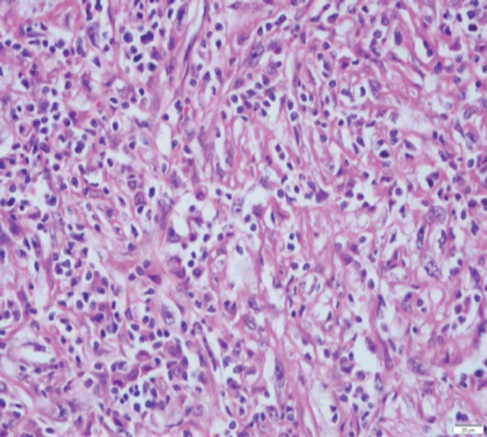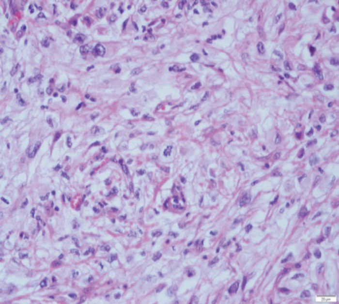 sRCC macroscopically, has a solid white appearance [Figure 1]. Microscopically, it contains spindle-like cells, cellular atypia and high cellularity which are features found in sarcomas [Figure 2]. They do not contain epithelial components and they can be uniform or heterogeneous. The majority will contain some carcinoma elements, while 90% will have tumour necrosis and 30% will have lymphovascular invasion. More than 80% of sRCC are found in clear cell carcinoma [10]. sRCC tends to be associated with high grade tumours however, more than 30% can also be found in low grade tumours [11]. Due to its aggressive nature and poor prognosis it is often looked at as independent prognostic factor when managing RCC.