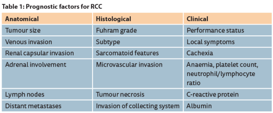 Pathological features which will determine the aggressiveness of the tumour include grade, stage, sarcomatoid features, vascular invasion, necrosis, invasion of collecting ducts and into peri-renal fat.