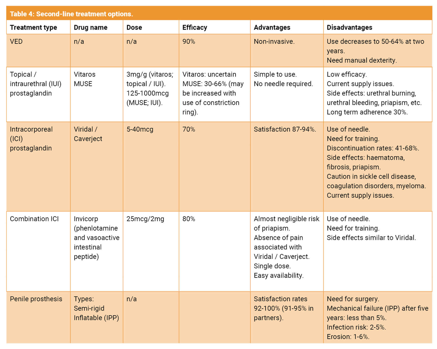 In patients who are true treatment failures, second-line treatment options should be discussed with the patient. This should include advantages and disadvantages of each treatment and referral for specialist services with an andrologist. The European Association of Urology guidelines suggest that part of the first-line approach for treatment could involve either switching the type of PDE5i, combining a short-acting PDE5i (i.e. sildenafil) to daily tadalafil or combining a PDE5i with a VED [16]. In addition, hypogonadal men may have better response if treated with a PDE5i and testosterone replacement therapy (TRT). Although there is no evidence that TRT increases the risk of prostate cancer or its relapse, its use should be implemented with a specialist [16]. The current guidelines recommend caution in prostate cancer survivors, avoidance in advanced cancer and treatment initiation at least one year after follow-up and with a prostate specific antigen (PSA) <0.001ng/mL [16].