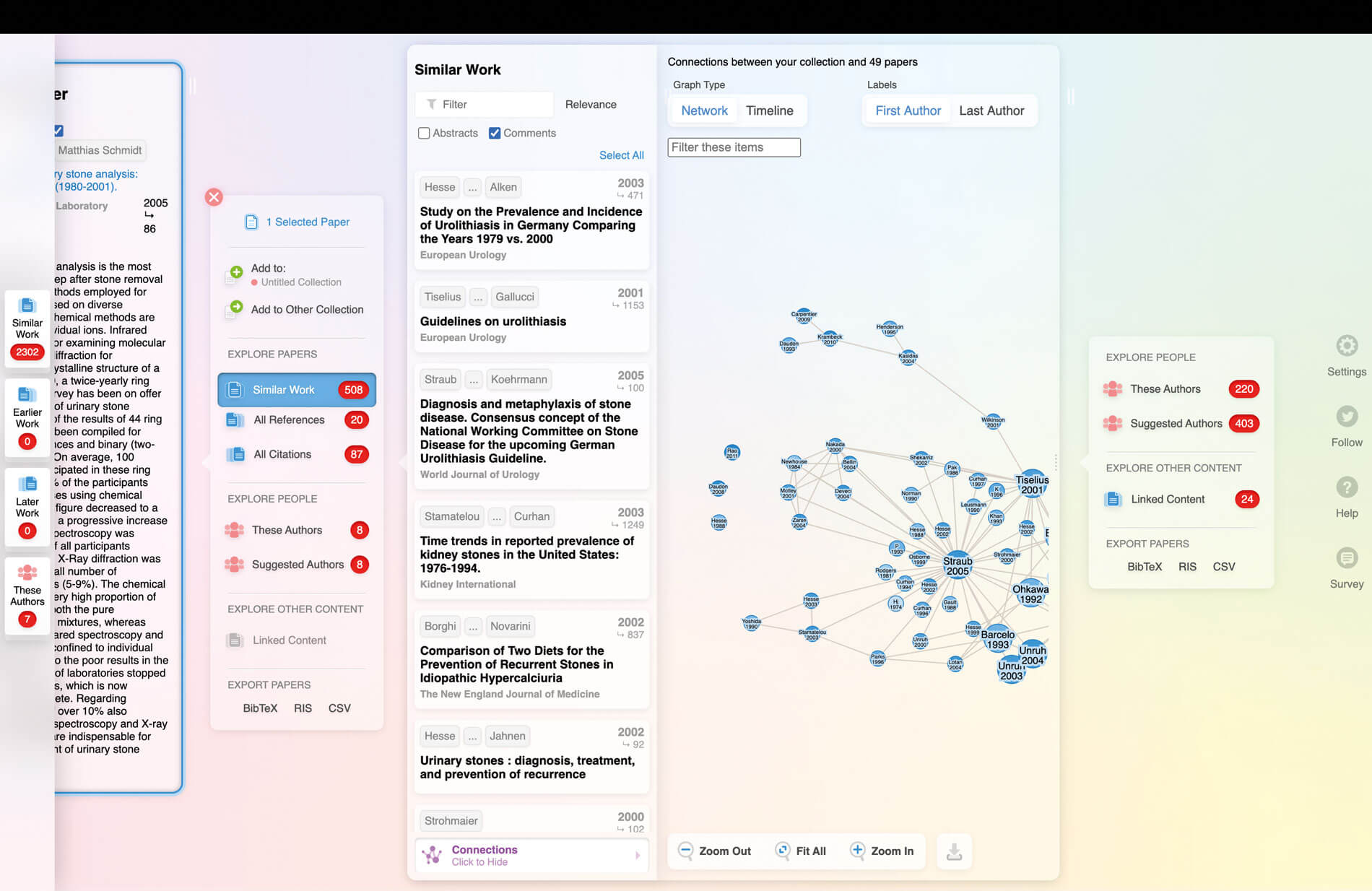 Marketed as the Spotify for papers, Researchrabbit.ai takes a similar approach to Connected Papers. Once you sign up, the front page asks you ‘to add a paper you know and love’ with a title, DOI, PMID or keywords. You can then explore Similar Work, References or Citations via a visual format in either a network or timeline format. Clicking on another paper (represented by a circle) shows the papers abstract and then sends you down a virtual rabbit hole as you can then select to explore that paper’s Similar Works, References or Citations in a further visual format or to Explore People or Other Related Content. At each stage a list of papers can be exported in BibTeX, RIS of CSV formats.