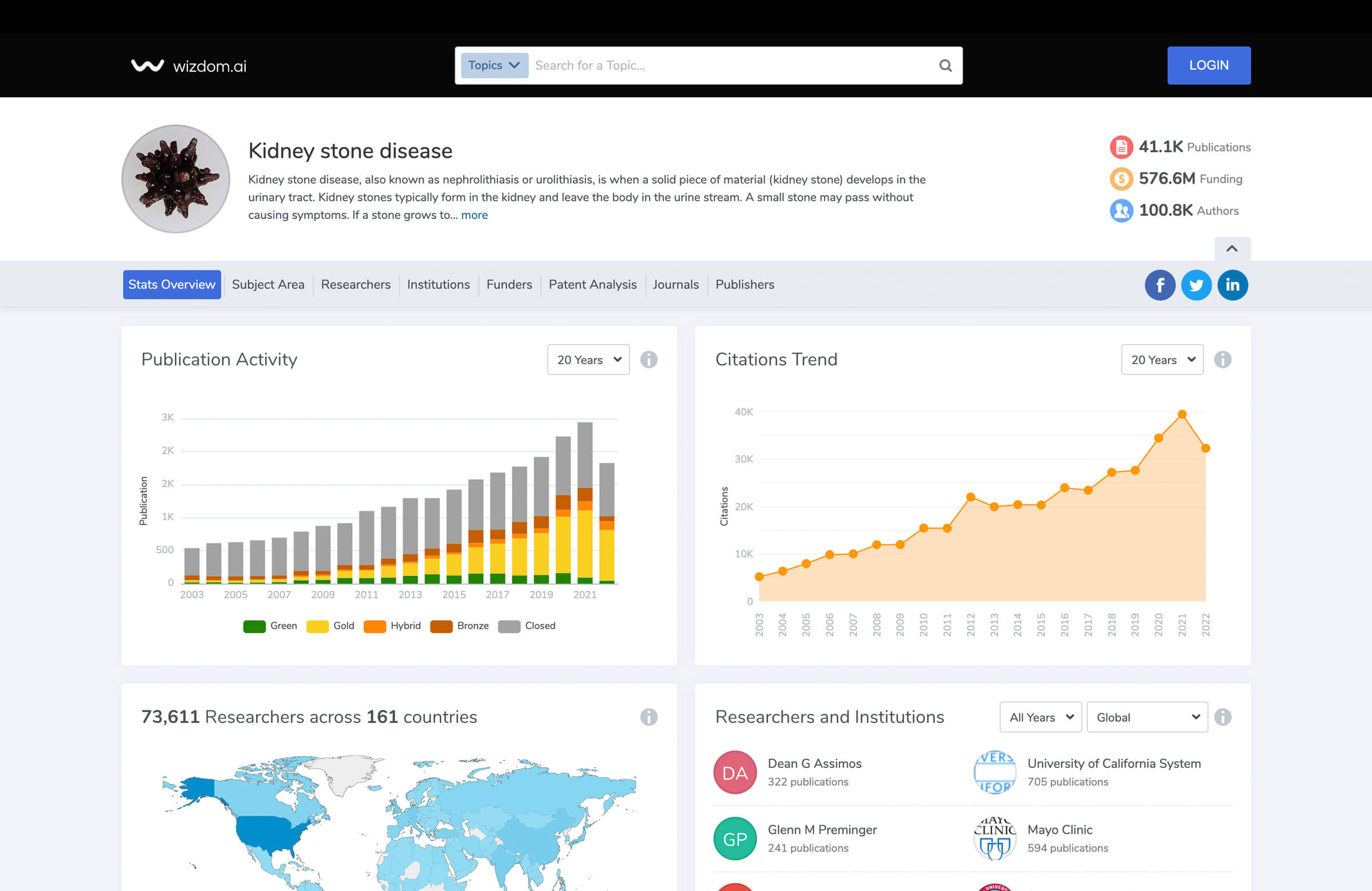 Wizdom.ai starts with a topic or journal and provides detailed breakdowns of the numbers of publications, citations, top researchers and top institutions related to the topic or journal. The top journals in the that particular field are listed, as well as a link to related keywords. Grant allocation by funding bodies is also listed for each topic displayed.