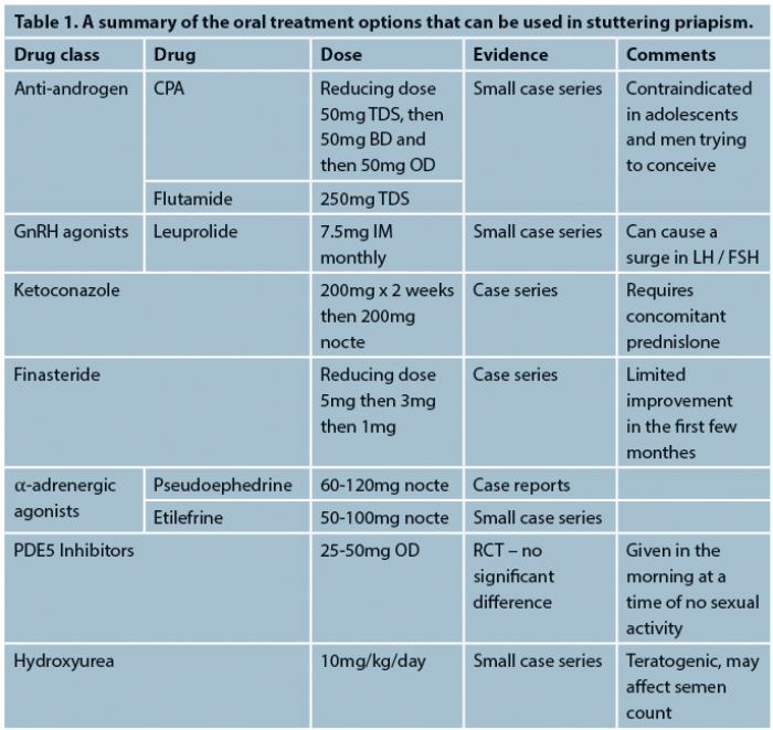 The aim of management in these men is to prevent further episodes of priapism [6,13]. As is often the case with rare conditions, the treatment options are based on poor quality evidence (Centre for Evidence-based Medicine Level 3 or 4). The European Association of Urology (EAU) guidelines primarily recommend either hormonal manipulation, -adrenergic agonists or PDE5i [6]. The evidence for and against these is highlighted below.