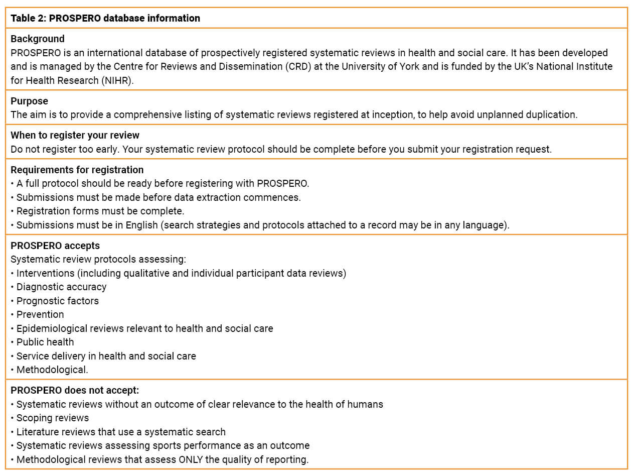 At this stage the study protocol should be registered with the different registry sites recommended by the Cochrane and Campbell collaborations. We recommend registering the research protocol with the International Prospective Register of Systematic Reviews (PROSPERO) [5]. A brief description of registration with the PROSPERO database is provided in Table 2.