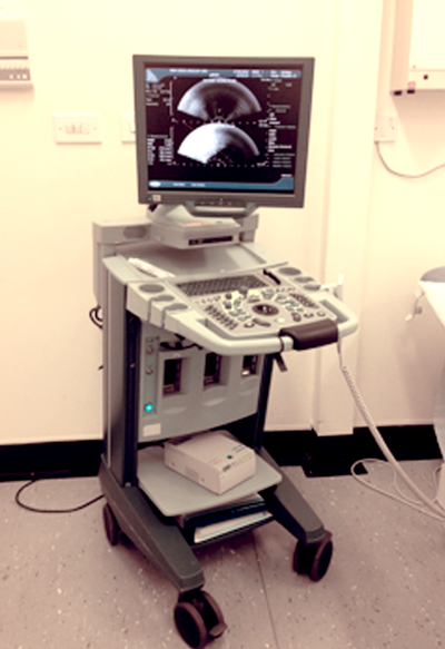 Transrectal ultrasound machine. It works by using high frequency sound waves which are produced by the passage of current through a piezoelectric transducer.
