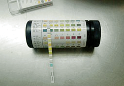 The picture shows a multistix urine test strip. It measures: pH, haemoglobin, nitrites, leucocytes, protein, glucose, ketones, specific gravity, urobilinogen.