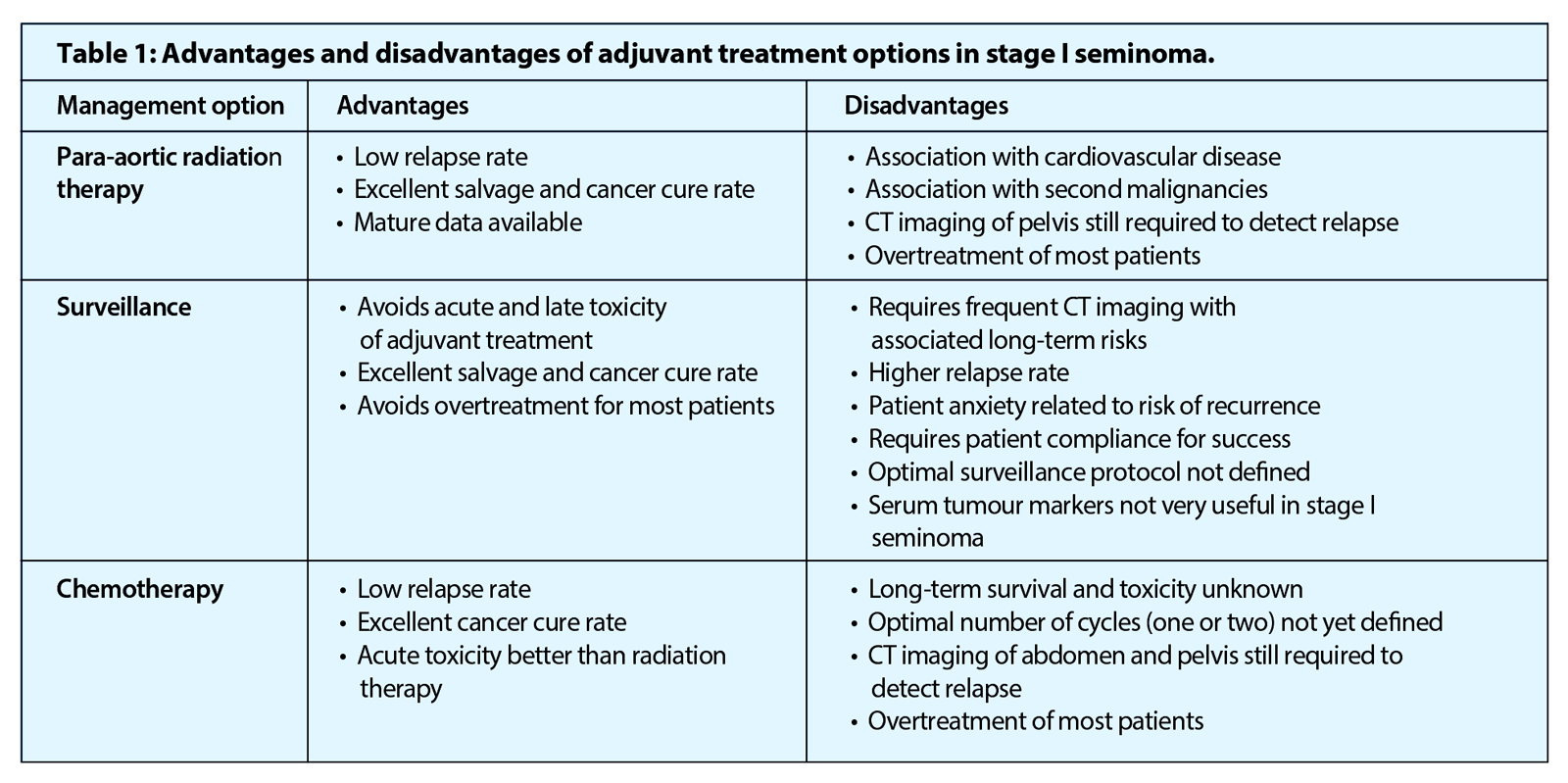 The main disadvantage of surveillance is that compliance is a key factor for its success. It requires commitment to reasonably intense follow-up from both patients and clinicians. The median time to relapse post-orchidectomy ranges from 12-18 months but there is a clinically significant risk of relapse more than five years after orchidectomy, which supports the need for prolonged follow-up [11].