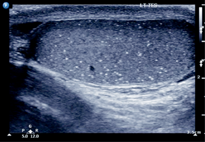 Five or more echogenic foci per high powered view, in either or both testes.