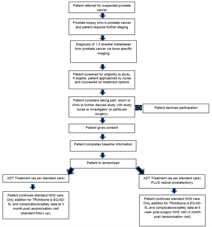 Therefore, there is an urgent unmet need for a randomised controlled trial examining the impact of surgery in men with newly-diagnosed oligometastatic prostate cancer. ‘Testing Radical prostatectomy in men with prostate cancer and oligoMetastases to the bone: a randomised controlled feasibility study’ (TRoMbone) aims to randomise 50 men to standard-of-care (ADT with / without docetaxel) versus standard-of-care plus radical prostatectomy with extended pelvic lymphadenectomy. All modalities of surgery (open, laparoscopic, and robotic) are allowed and a quality assurance programme is built in, mandating only one surgeon per centre perform these cases, evidence of >100 cases performed prior to the study, and a median lymph node yield >10 nodes using a standardised templated dissection (common iliacs, external iliacs, internal iliacs, obturators, fossae of Marcille).