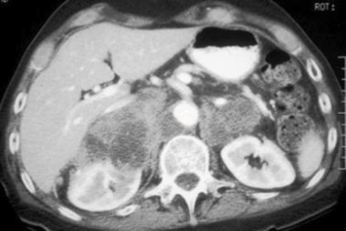 Bilateral enlarged adrenal glands, with hetrogenous appearance.
