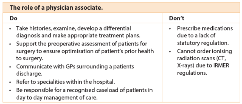 Physician associates are employed on a permanent basis either in primary or secondary care. PAs have not been practising in the UK for many years but in the USA the role itself is well established as previously mentioned. PAs in the USA hold their post, on average, for approximately five to six years [1]. This length of time spent in a speciality can be seen as invaluable as the individual will learn new skills and provide patients with a highly specialised continuity of care. PAs also develop long-standing relations with the MDT such as nurses, pharmacists, social workers and physiotherapists.