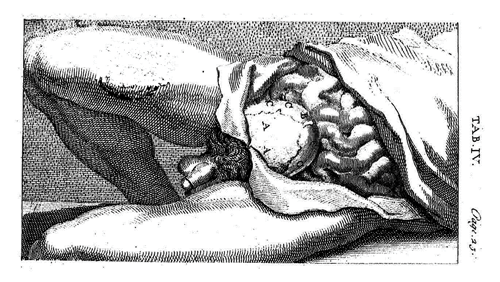 Figure 1 (below left): Plate from Cheselden’s book showing how the distended bladder