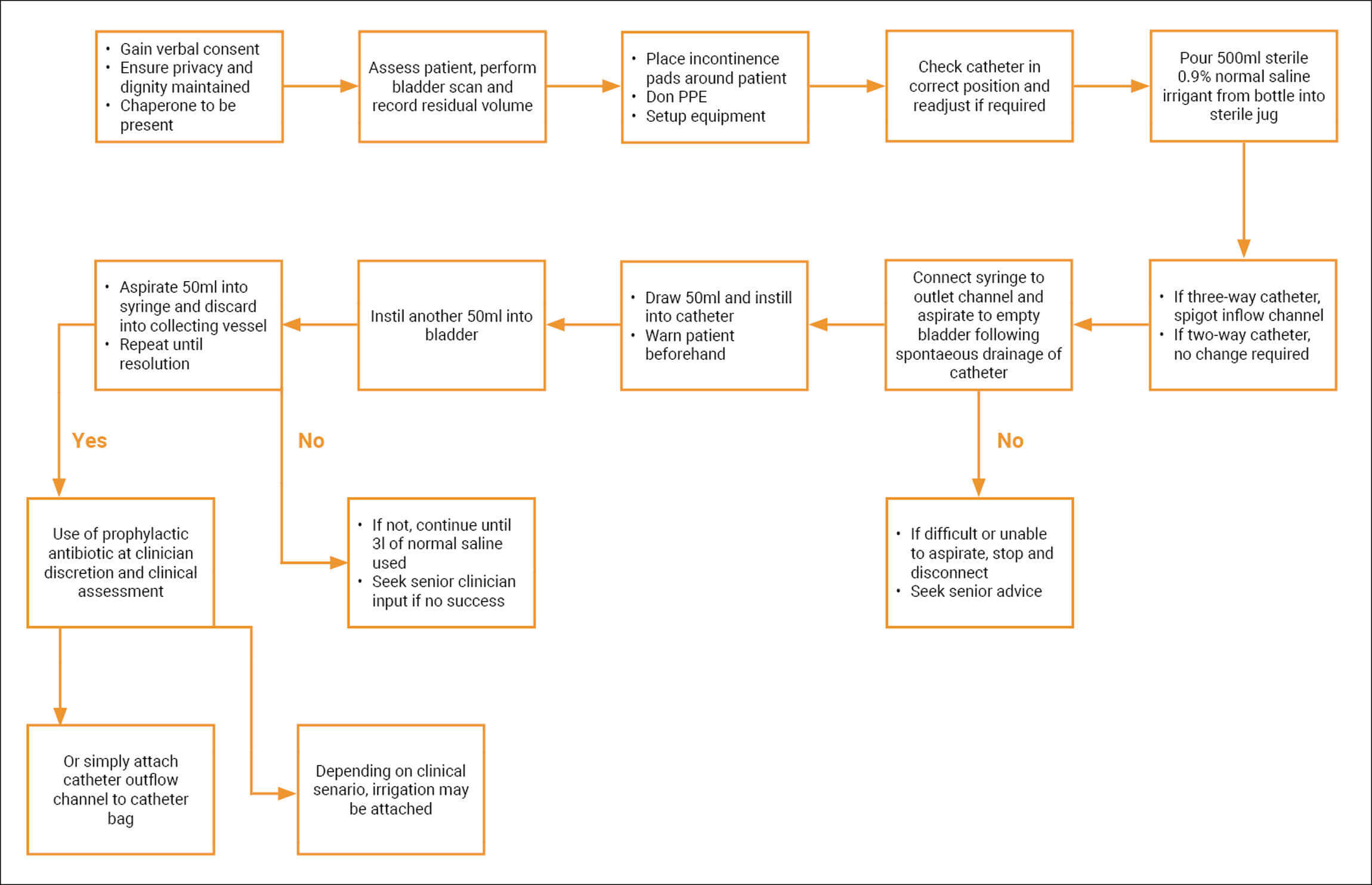 - If the urine is not clear or clots still persist, seek senior (registrar / consultant) advice.