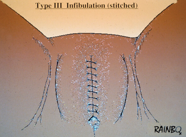 Type III - known as infibulation, consists of narrowing the vaginal opening by cutting and sewing the labia majora and / or the labia minora with or without clitoridectomy: