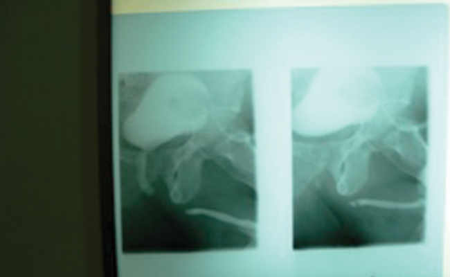 Urethrogram showing the length of the defect and requiring repair in the posterior urethra.