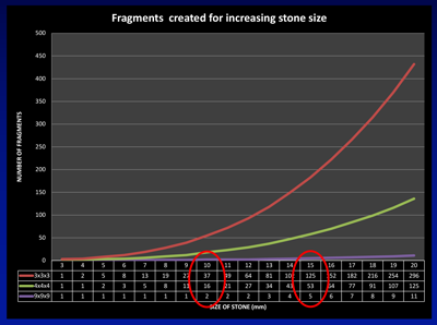 This can be demonstrated from the curves shown in Figure 1a and b. Assuming the stone is a sphere with its diameter increasing in 1mm increments on the X axis, according to the formula for an ellipsoid (volume = π x L x W x D x 0.167, which can be approximated to the diameter cubed and divided by two for day-to-day practice) its volume increases exponentially, such that a stone that doubles in diameter from 10 to 20mm has an eight-fold increase in its volume. Figure 1b shows the implications of this increase in volume in terms of the number of fragments stones of increasing size are comprised of. Assuming no disintegration of the stone during fragmentation, a stone of 10mm would generate 37 three-millimetre fragments, increasing to 125 fragments for a 15mm stone, and just under 300 fragments of this size from a 20mm stone.