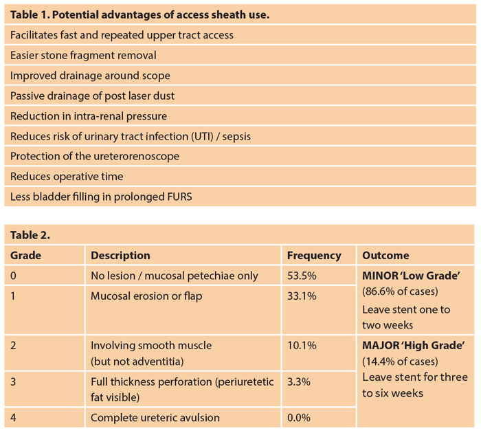 Reassuringly, this large study, based on 2239 patients, found no increased risk of intraoperative complications such as ureteral damage or bleeding from the use of an access sheath (a 1.1% ureteric perforation rate with an access sheath compared to 1.2% without). As would be expected, there was a tendency for an increased likelihood of a JJ stent following access sheath use (90.6% of patients versus 82.0% in whom a sheath was not used). The article noted that postoperative infectious complications were reduced in patients in whom an access sheath had been used, attributable to reduced intra-renal pressure in these patients [8].