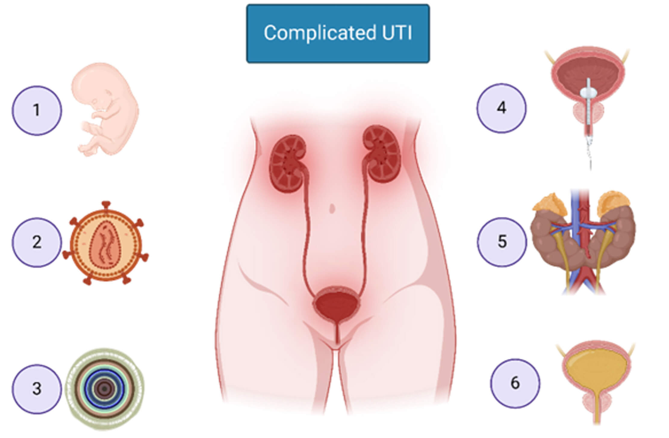 Figure 2: Factors which make UTI complicated: 1.) Pregnancy; 2.) HIV / immunosuppression; 3.) Stones; 4.) Instrumentation; 5.) Anatomical abnormalities; 6.) Enlarged prostate. Created in BioRender. Ridha, M. (2025) https://BioRender.com/fyj4nbj.