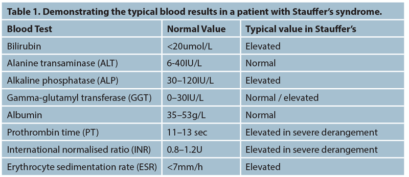 The abnormalities Stauffer described were renal cell carcinoma with associated hepatosplenomegaly and deranged liver function. The liver enzyme results showed a cholestatic picture with an elevated bilirubin, alkaline phosphatase (ALP), alpha-2-globulin and gamma-glutamyl transferase (GGT) as well as an elevated erythrocyte sedimentation rate (ESR) and a prolonged prothrombin time (PT).