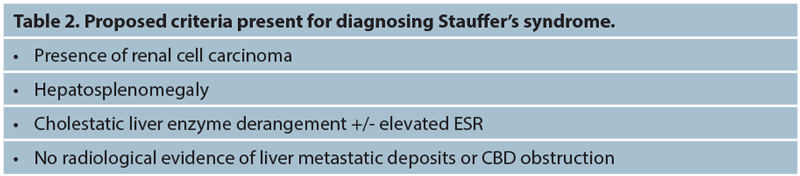 There are currently no diagnostic criteria for Stauffer’s syndrome and it remains a clinical diagnosis with the underlying presence of a renal malignancy being a necessity. Notably, there must be no other cause of cholestatic liver derangement.