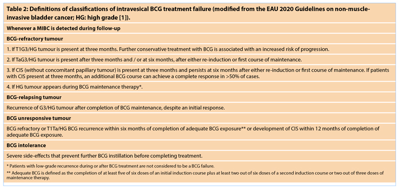 The definition of BCG unresponsive tumours was developed in consultation with the FDA to help with the design of future clinical trials for this patient group in 2016, as at that time there was no effective therapy for BCG-unresponsive NMIBC. Table 2 describes the definitions for these different types of BCG failure.
