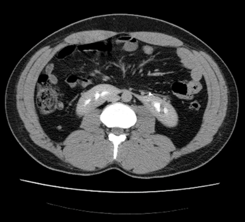 Plain coronal CT kidney, ureter, bladder (KUB) demonstrating crossed fusion renal ectopia; one case in 1000.