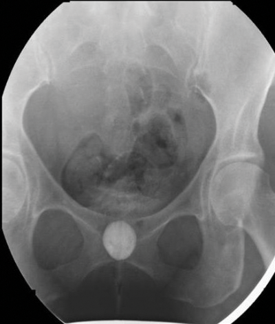 Figure 1a: Erect image taken from a voiding cystourethrogram