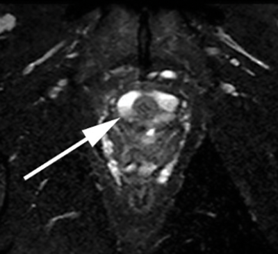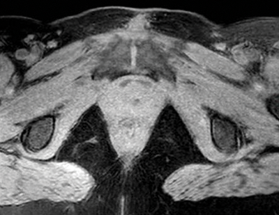 Figure 3a: Axial T1 fat sat pre gad - the urethral diverticulum cannot be seen.