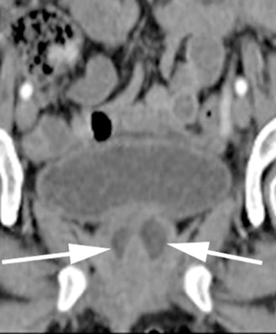 Figure 2b: Coronal CT showing urethral diverticulum (arrows).