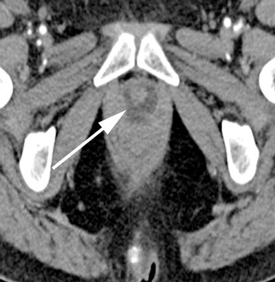 With CT imaging, diverticula appear as hypointense periurethral cystic lesions, with wall thickening and enhancement [2]. They are usually identified at the level of the pubic symphysis (Figure 2). Using voiding CT urethrography, the diverticula may opacify upon post voiding imaging [2]. To a limited extent CT can characterise urethral abnormalities [2]. It can also identify associated complicating urethral calculi and gas within the diverticula and allows for regional staging of any urethral neoplasms [2]. The disadvantage of CT is the use of ionising radiation and it is rather insensitive for small diverticula [4]. Figure 2 demonstrates a urethral diverticulum on CT imaging. Note the low attenuation, thick walled cystic density structure around the urethra measuring 2.7 x 2.0cm.