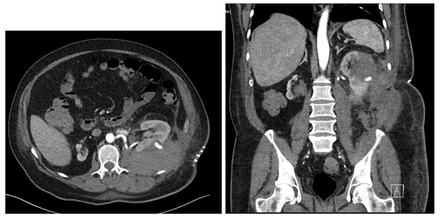 Figure 2: CT (axial and coronal) of the pseudoaneurysm and perirenal haematoma.
