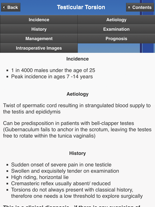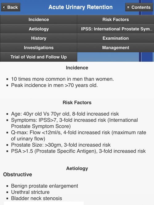 The Urological Emergencies app provides a series of topics relating to common urological emergencies. The layout is similar to the Urology News app with a central ‘Contents’ menu detailing various emergency conditions. A tap reveals more on each condition, on a single scrolling page and the sections can be easily accessed through a series of shortcuts at the top of each page. Each section provides a structured approach to the diagnosis, investigation and management of common urological emergency conditions. At the bottom of the ‘Contents’ page there is a link to relevant British Association of Urological Surgeons (BAUS) consent forms and information on the authorship of the app.