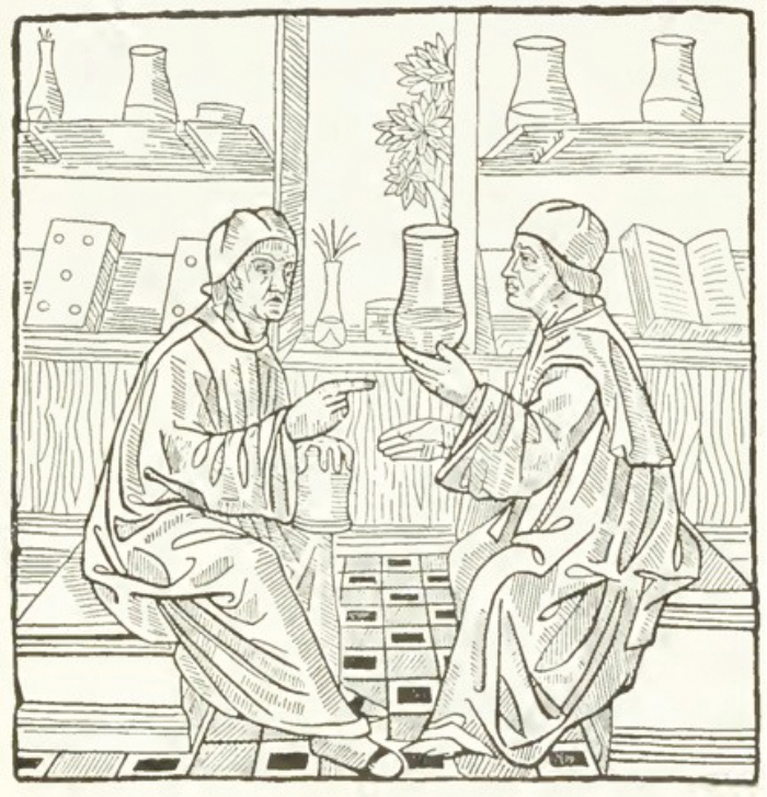 Figure 3: Mediaeval doctors examining urine in a Matula.