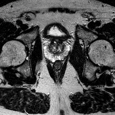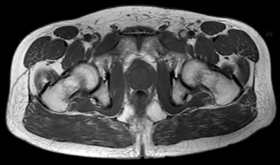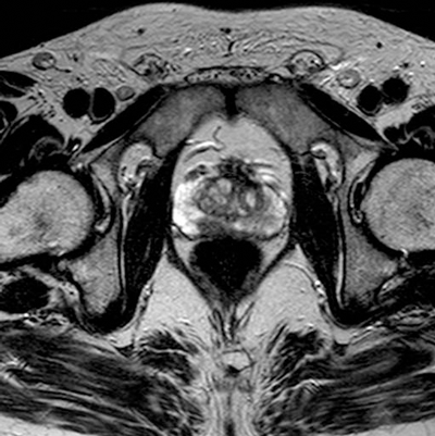 Figure 1: Axial T1 image showing homogeneous low signal appearance of the prostate.