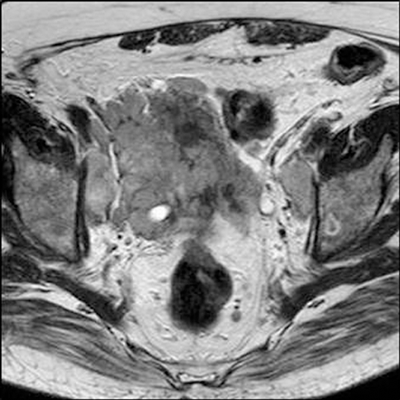Figure 7: Axial T2 showing extensive prostate tumour invading the bladder and bilateral iliac lymph nodes.