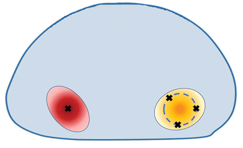 Figure 2: Centroid (red lesion) vs. ring (orange lesion) targeting.
