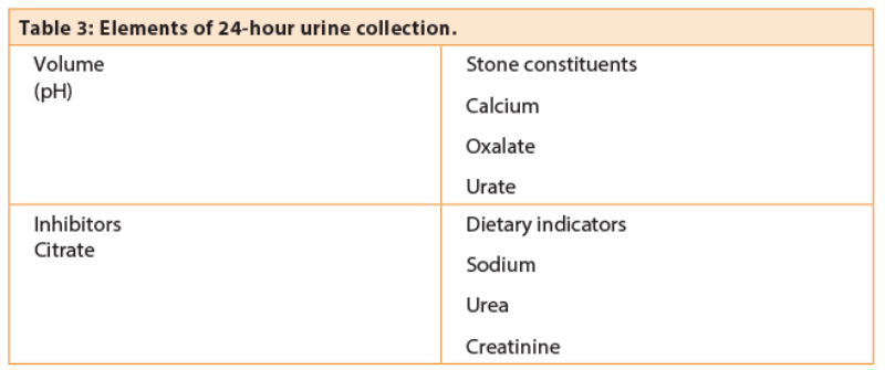 The methodology of urine testing varies between units and should be planned in conjunction with the local laboratory. Usually two 24-hour urine samples is preferred as the accuracy increases after a second sample [5]. The purpose of 24-hour testing is fourfold (Table 3):