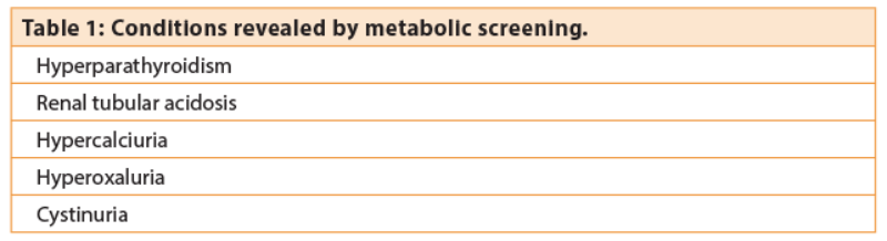 The argument for employing stone preventive strategies is therefore a strong one. Simple dietary advice, screening for hypercalaemia and gout is the traditional approach currently widely employed. But why bother doing anything more? “Increase fluid intake to 2L, check calcium, check urate . . . the benefits of any other strategies are unproven” is often standard teaching. However, a case can be made that the urologist is in a unique position to identify other diseases, the identification of which will have implications for long-term health. Table 1 highlights some conditions that may be diagnosed from metabolic screening.