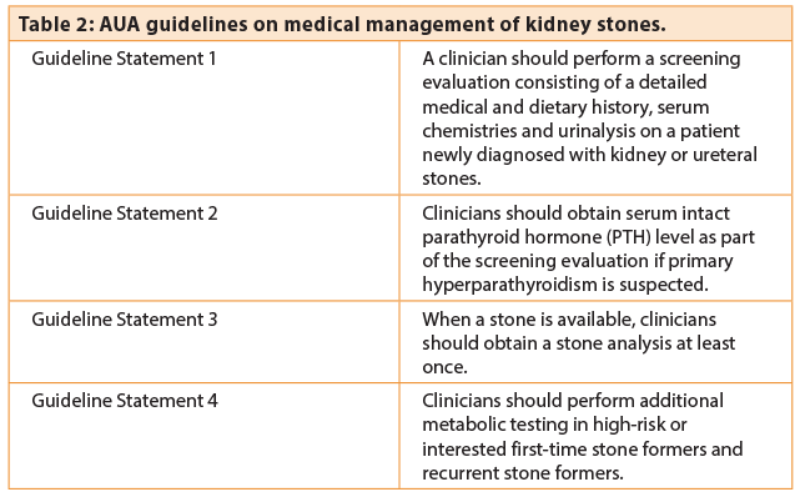 Both American Urological Association (AUA) and European Association of Urology (EAU) guidelines recommend metabolic evaluation to varying degrees. The AUA recommendations are extensive and cover screening, diet, metabolic testing and therapeutic medical management (Table 2) [2].