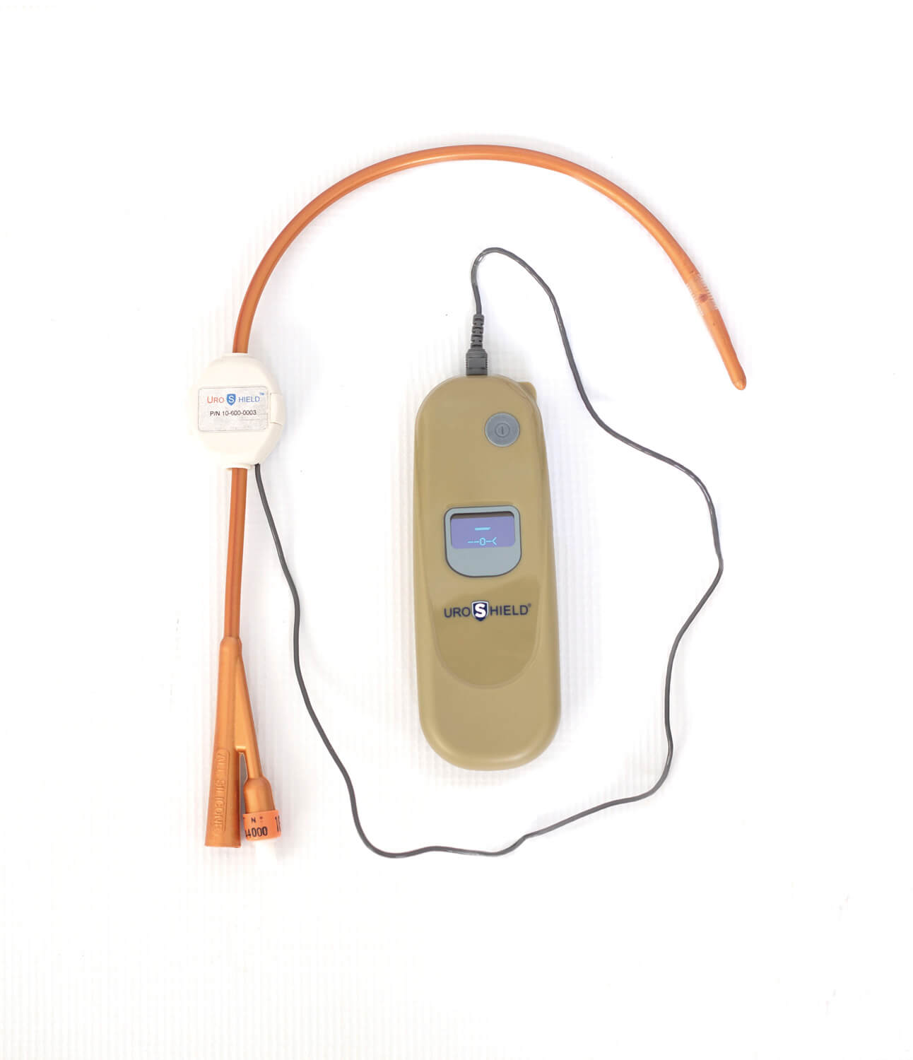 The UroShield™System consists of 2 parts, a driver which supplies the power and an actuator which is attached to the catheter. The driver can be attached directly to the power outlet or operate on battery power. The actuators are attached to the exterior part of any indwelling urinary catheter through suprapubic or urethral route and are changed every 30 days for optimal ultrasound transmission and hygiene.
