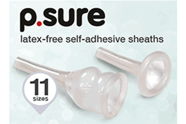 p.sure is our longer-length, latex-free self-adhesive sheath, available in 11 sizes (18mm-40mm). It’s 130mm in length, good when there is more surface area for the sheath to adhere to. The buffer zone is 75mm, adhesive zone is 50mm, with a standard adhesive. Available on prescription. Please contact the helpline for more information.